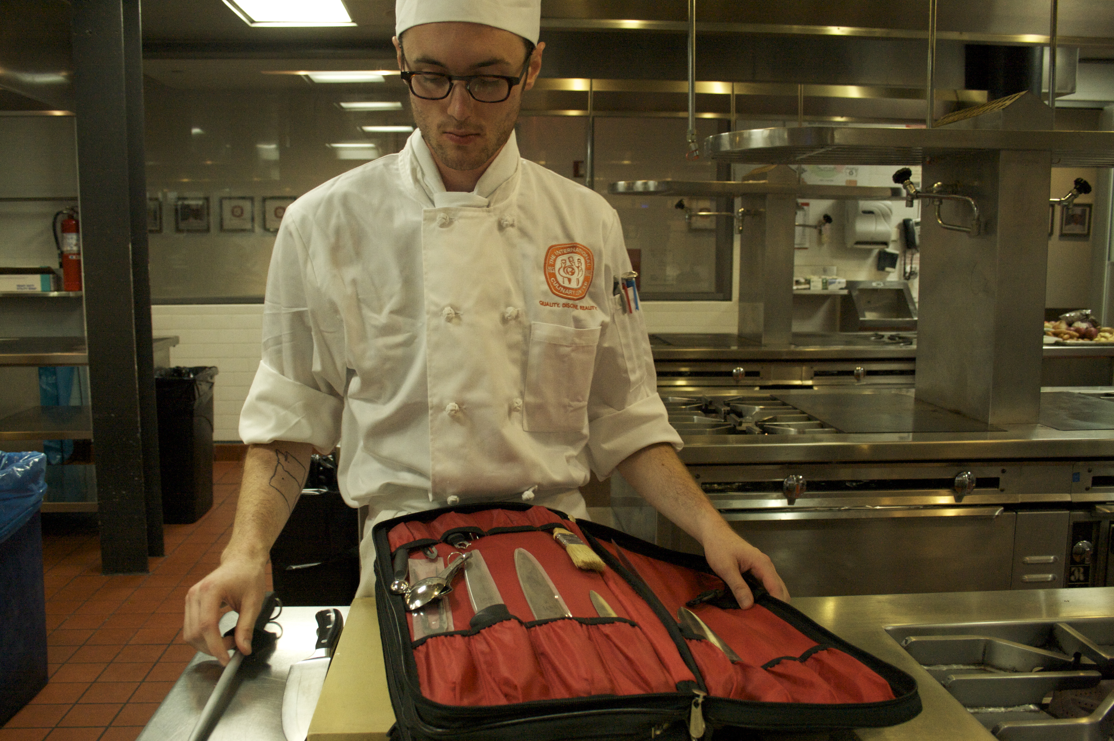 My bulbous outfit has me worried today—my first day of school—because Chef Candy Argondizza, vice president of culinary made a point at orientation to look sharp. Picking up my apron like an evening gown every time I take a step isn’t a move in the right direction. But when class commences, I realize I’m not the only miniscule student (just one who wasn’t smart enough to get her uniform tailored).