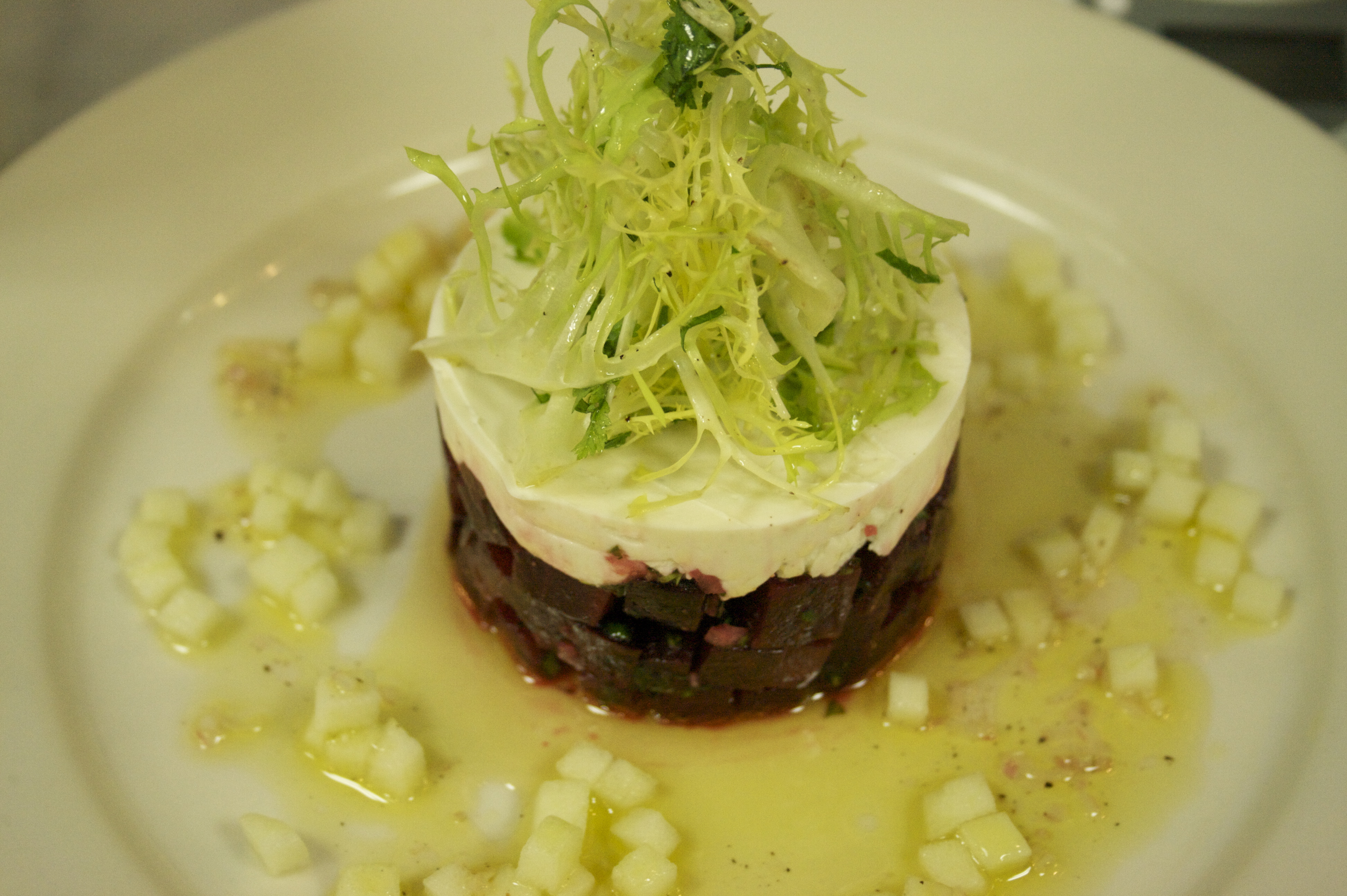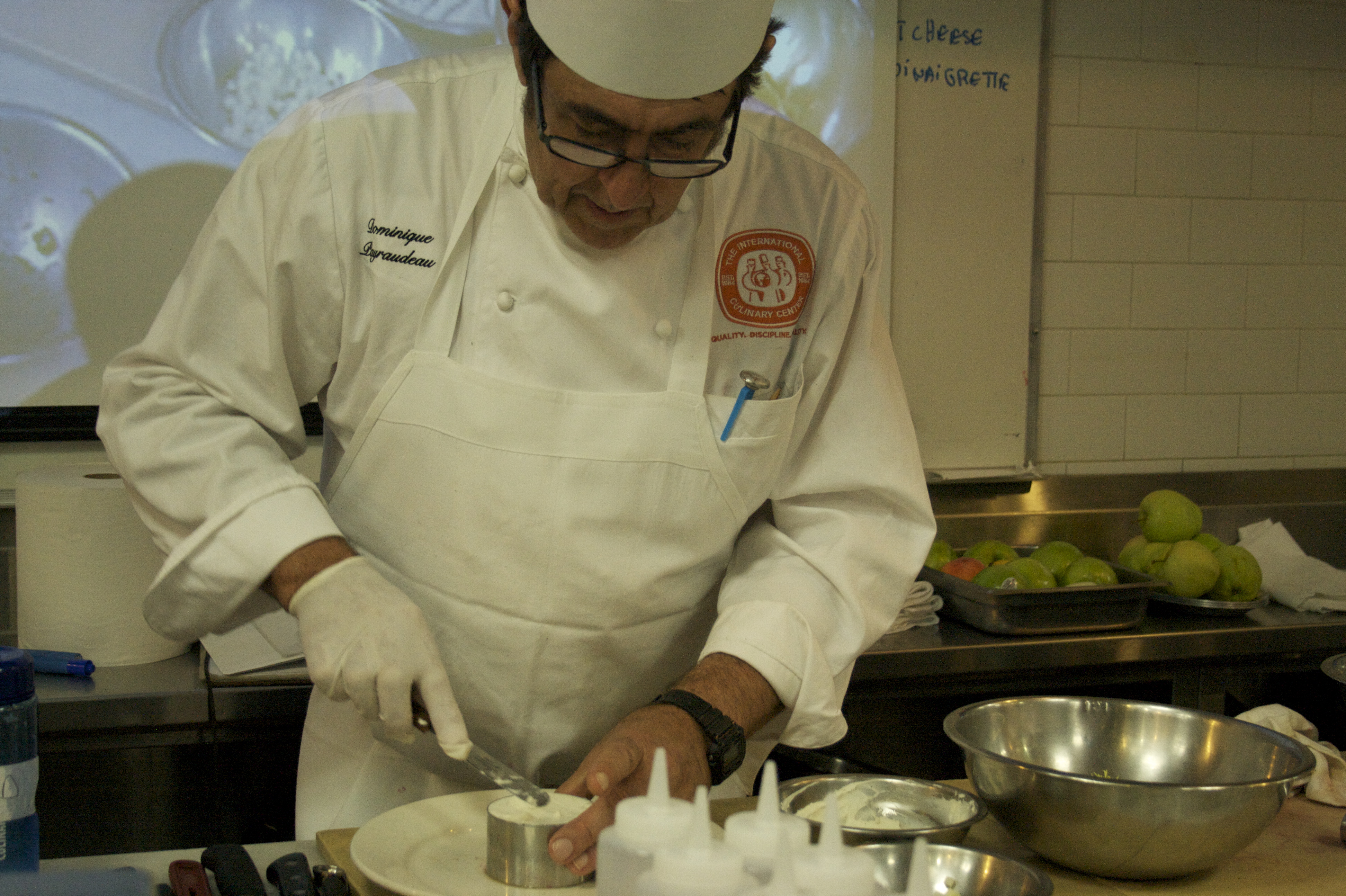 We spend our last two hours of class staining our hands pink as we make a beet salad. We’re introduced to a cool tool, a Timbale, which is a mold that’s responsible for making cylindrical dishes. Once I finish packing my Timbale with our vinaigrette-dressed beets, I feel like I’m playing Jenga. Slowly lifting this mold is making me sweat because I fear my edible Tower of Pisa would topple right in front of me. Luckily it didn’t. Critiques prove that I forgot to salt my beets. Sacre bleu!