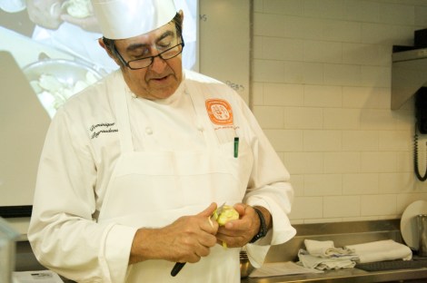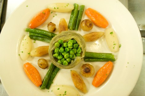 We incorporated our tournage when we made our Garniture Bouquetiere, a dish of vegetables cut in extraordinary shapes that usually accompanies a meat dish. The dish centers around an artichoke heart, which is my favorite vegetable. My Italian-French mother makes artichokes frequently, but she doesn’t make these prehistoric-sized ones. We eat the baby artichokes, and eat all the leaves (without mayonnaise or a vinaigrette dipping sauce, like in the French fashion). But in class, when we tackled these giant artichokes, we cut away all the leaves by the tournage method, and broke off the stem, which sounds like cracking bones. (But Chef promises to use the trimmings to make an artichoke soup.)