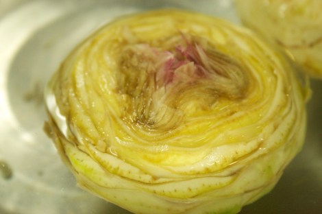 TIP OF THE DAY: If you want to preserve artichoke hearts, prepare the following solution (called “dans un blanc”), bring it to a boil, and then drop in the hearts and let simmer until tender. The hearts can be refrigerated in the liquid for a week. (You’ll need a scale to measure these ingredients.)