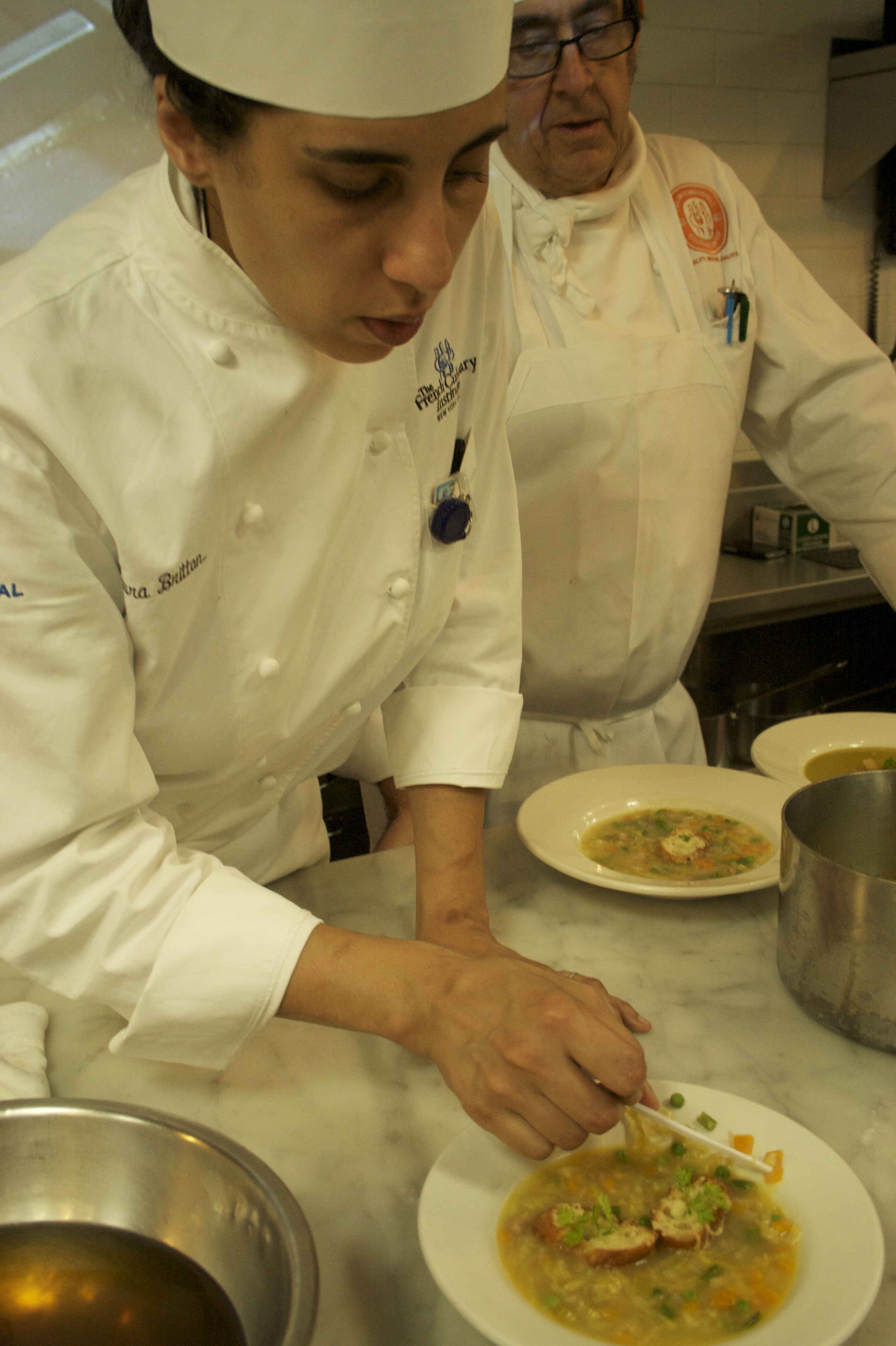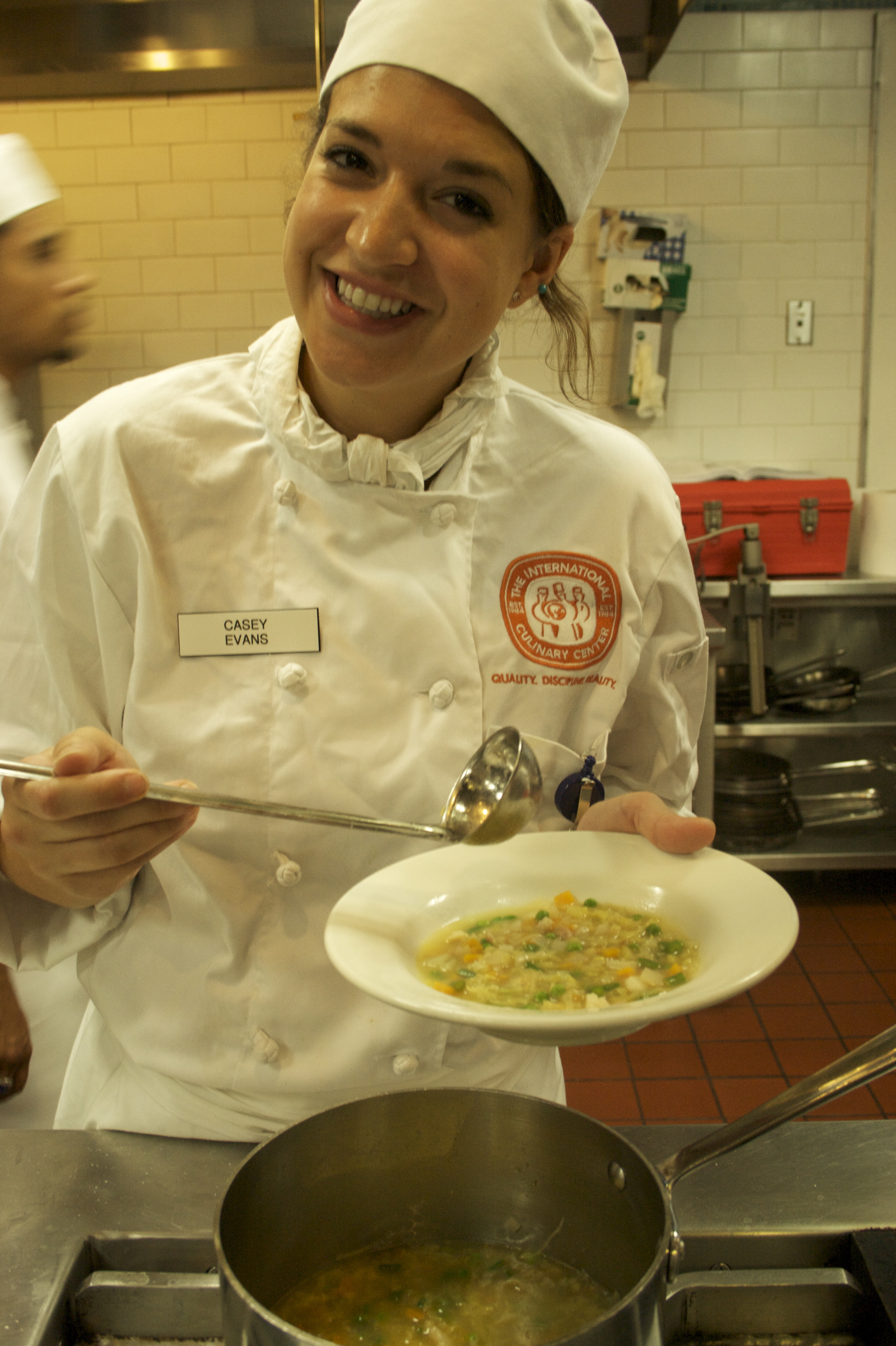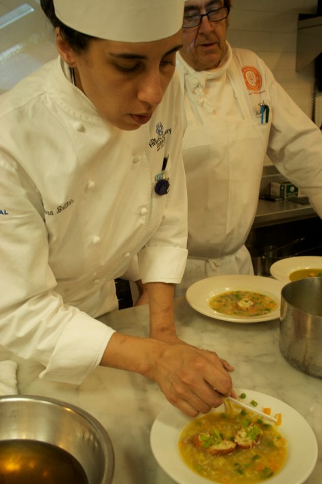 It’s a long day of peering over pots of liquid, continually tasting them, and adding a ton of salt until they begin to taste like something. We made a split pea soup with croutons (which are pretty much bread cubes soaked and sautéed in butter—yum!), a farmer-style vegetable soup, a French onion soup, and a beef consommé.