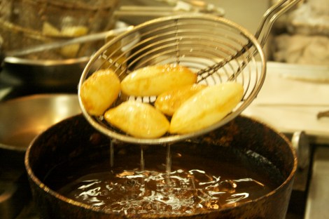 Potato day also means we’re introduced to the deep-fryer: An ancient black steel pot that’s pretty cruddy looking. I’ll admit that a pot full of oil raised to temperatures above 300 degrees Fahrenheit terrifies me. But as long as you keep an eye on your temperature and watch out for any splashes, you should be fine. (But my propensity for clumsiness always keeps me on guard.)