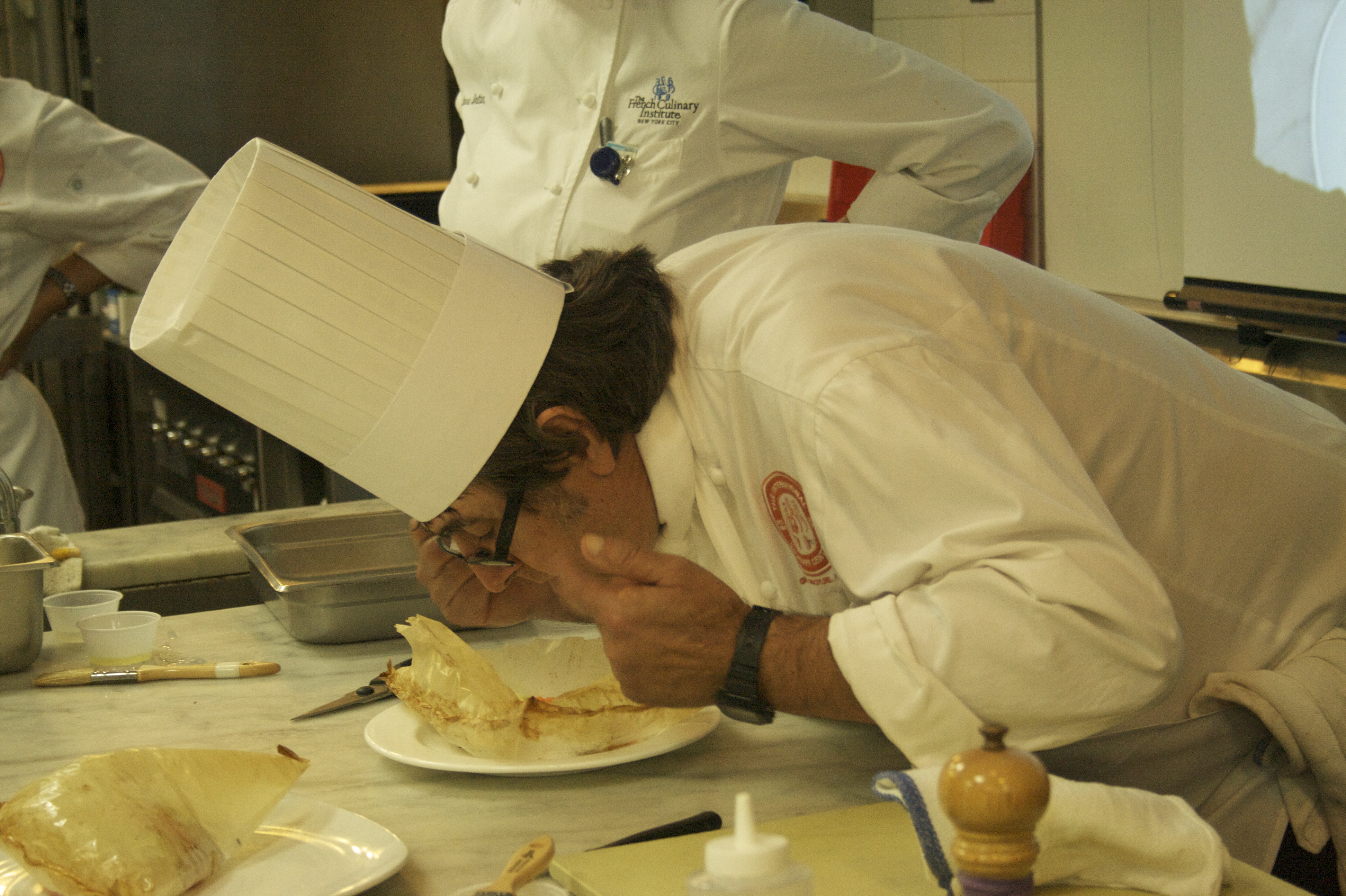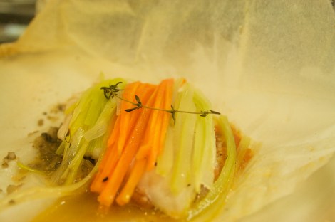 Once we broke down these fillets, we transformed the sea bass into a poisson en papillote, or fish in a parchment pouch. It’s one of those culinary moments you say a prayer to the Gods that you hope everything turns out right: The fish has to be cooked, but not dry. And your parchment pocket must balloon up and not deflate before Chef sees it. If everything is done correctly (and for the most part, we did), when you cut open the bag (as if ripping into microwavable popcorn), you’re struck with a whiff of aromatic vegetables, herbs, and delicate fish that’s been steaming in white wine. This was my lunch. Jealous?