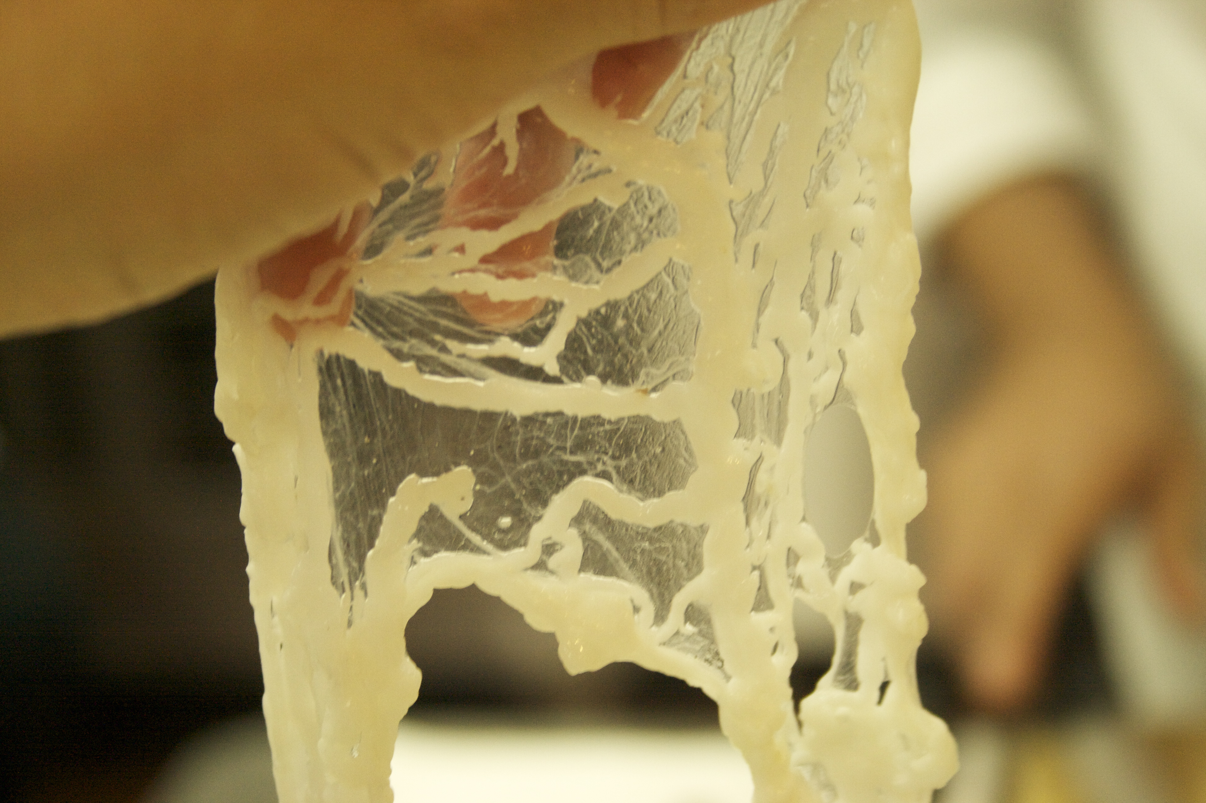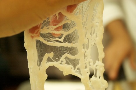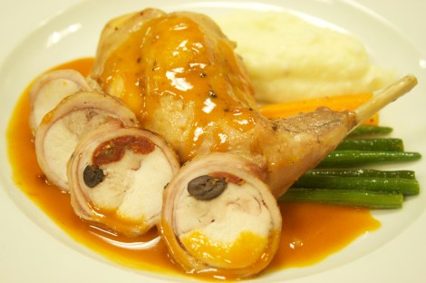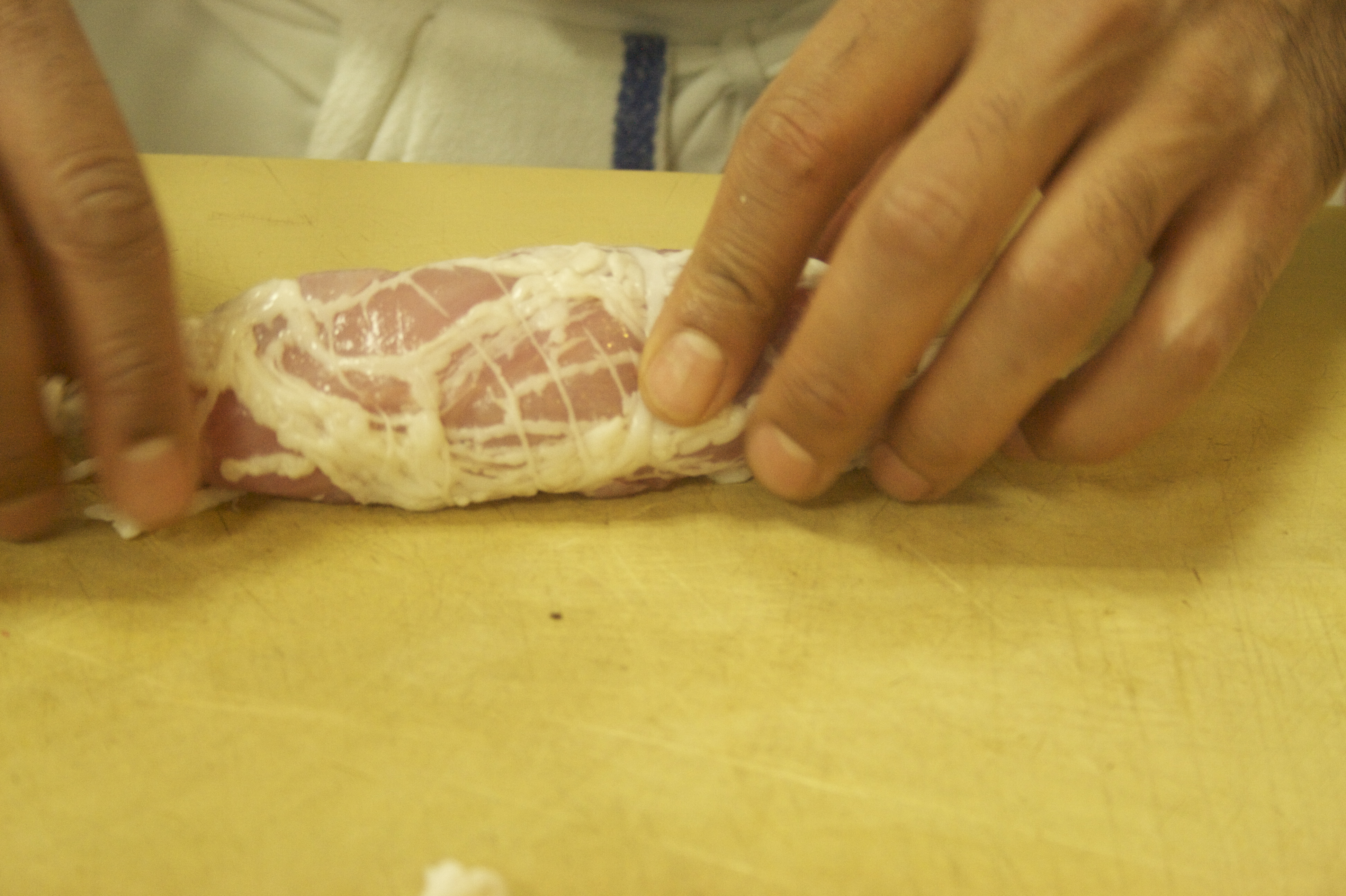 We browned the legs and finished them in the oven, but for the loins, we took this cutlet-type cut, and stuffed it with sun-dried tomatoes and olives. Then we rolled it in caul fat to keep it together. If you’ve never heard of caul fat, it’s basically the fatty web-like lining of an animal’s abdominal cavity.
