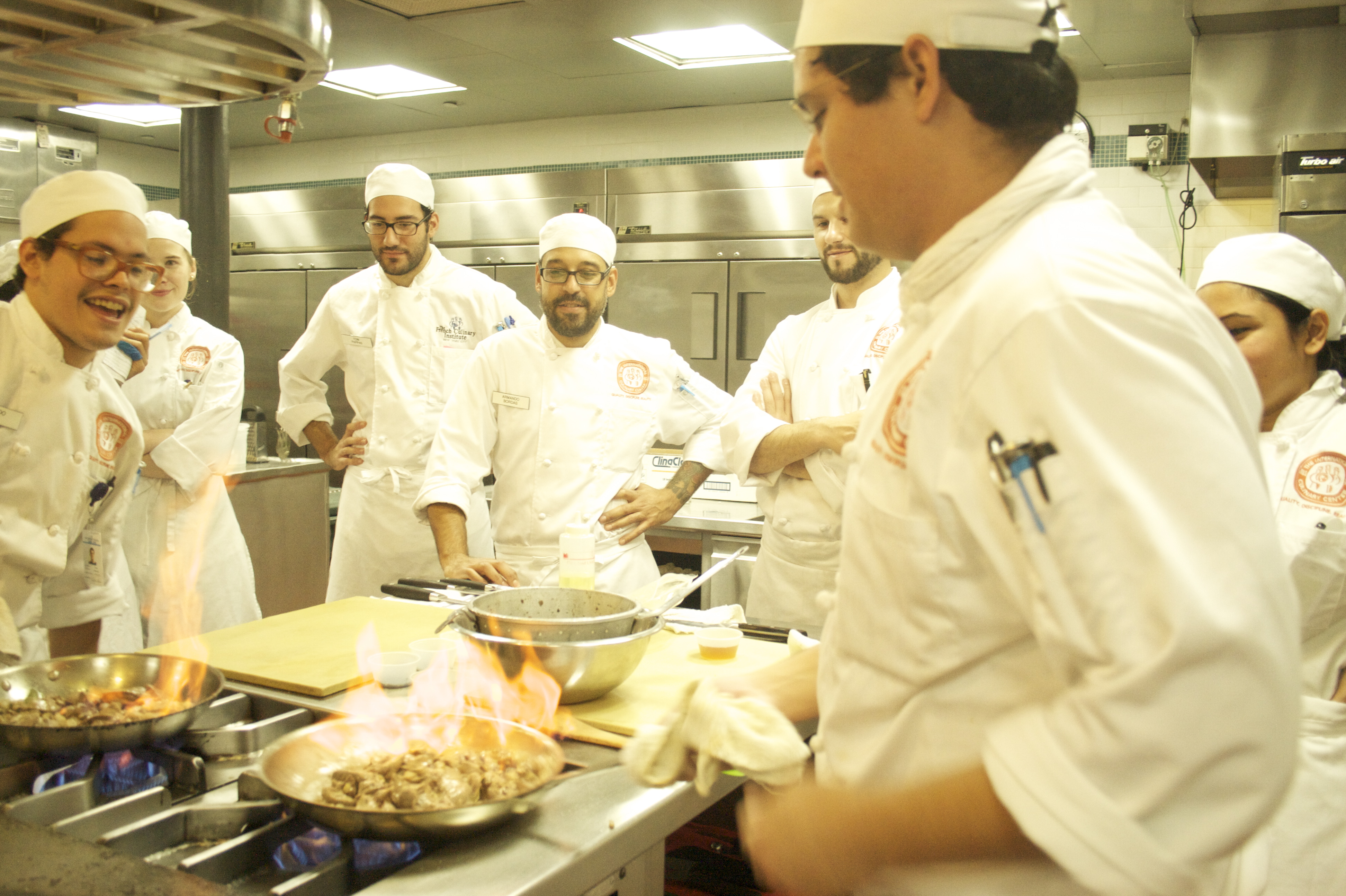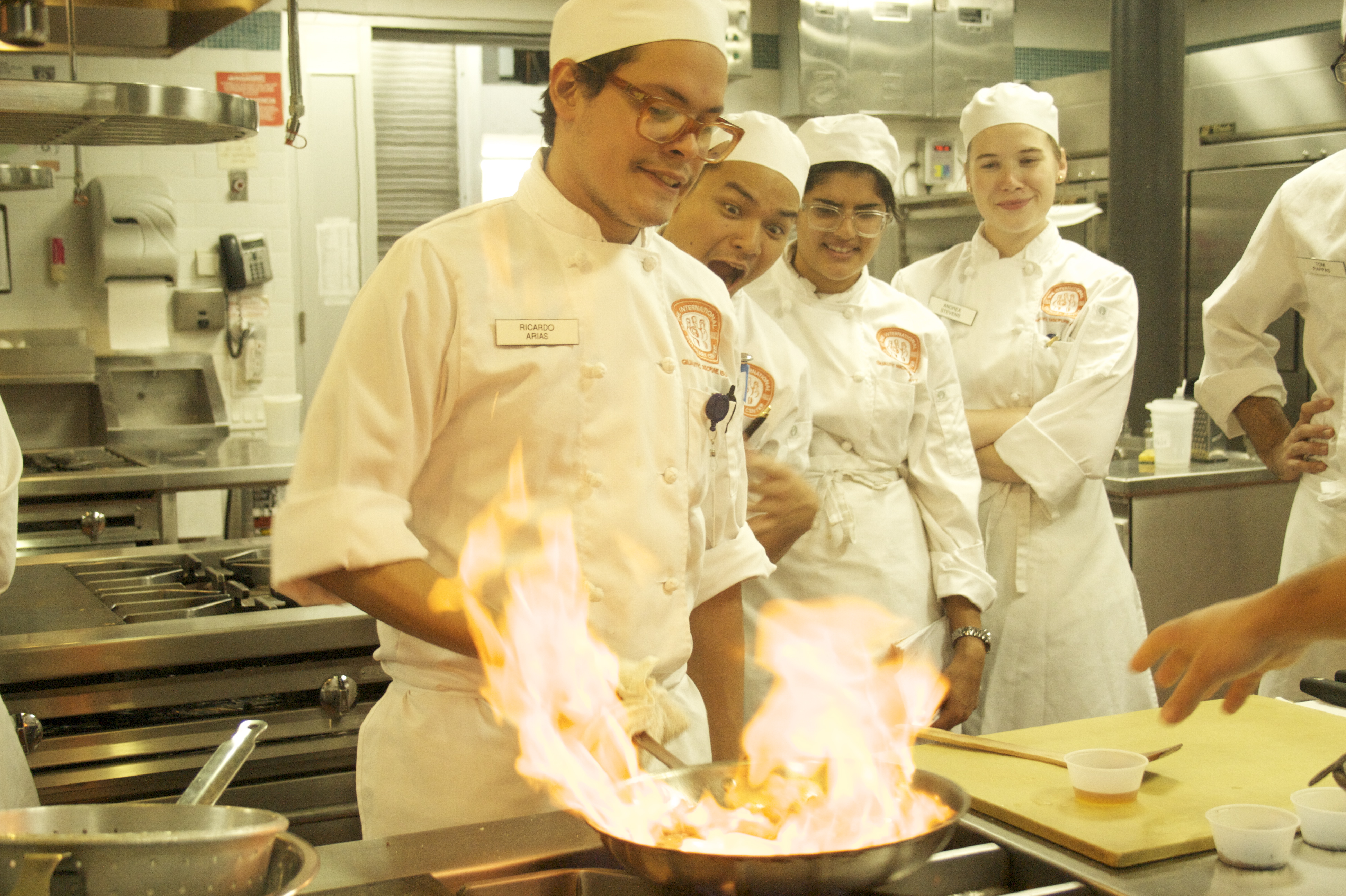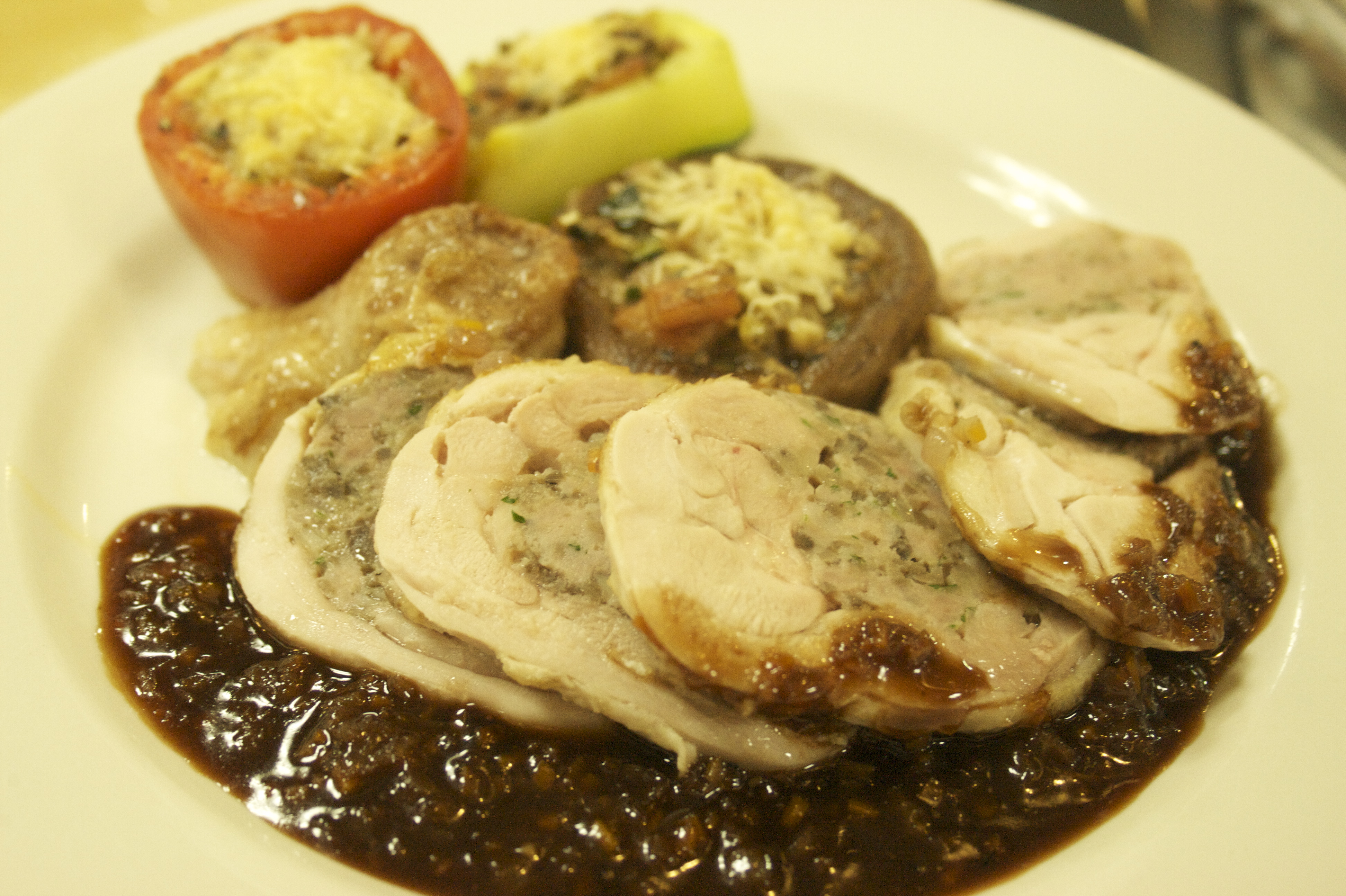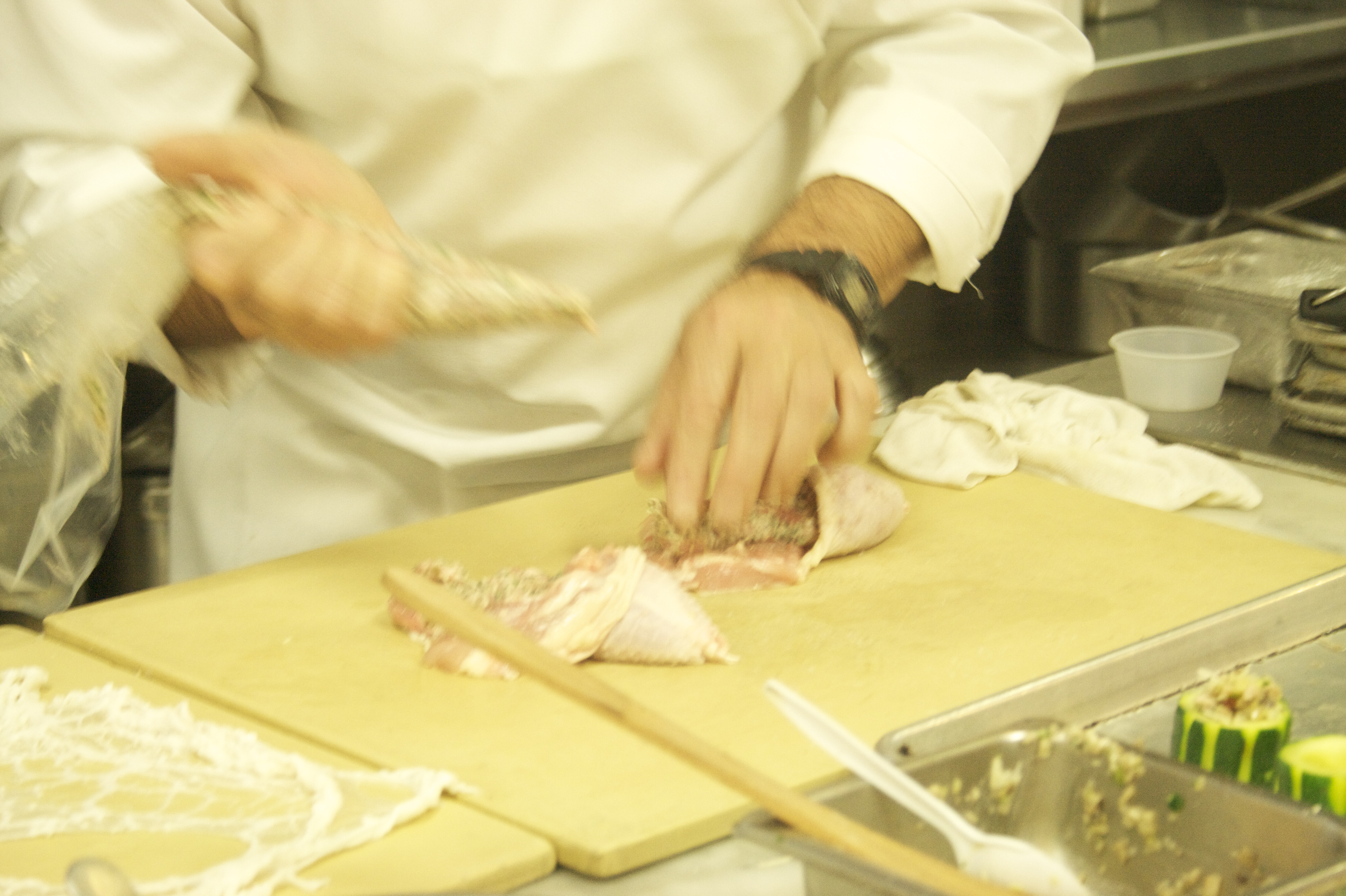 I think everyone’s ears perk up when you hear the word “stuffing.” It’s probably the best side dish on the Thanksgiving table, but what we did in class today was nothing like anything I’m familiar with. We made a stuffing from minced, sauteed mushrooms and mixed it with raw pureed poultry. (And when Chef popped some in his mouth to check the seasoning, my skin started to crawl.) Then, we piped it into a deboned chicken drumstick and baked it. Simple, right? Not. It kind of made me miss grabbing fistfuls of stuffing and packing it inside a turkey.