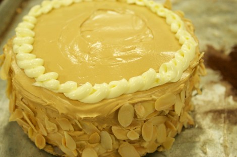 We spent the other part of our day making a genoise cake, or an egg-foam cake. And just like puff pastry, genoise doesn’t need any baking soda or powder to rise. Instead, we beated egg yolks until our arms screamed. And the air that was incorporated to the yolks caused the cake to rise. Pretty nifty, huh? We topped off these cakes with a coffee buttercream. And because I’m so absent-minded, I forgot to take a picture of mine, so here’s my classmate’s.