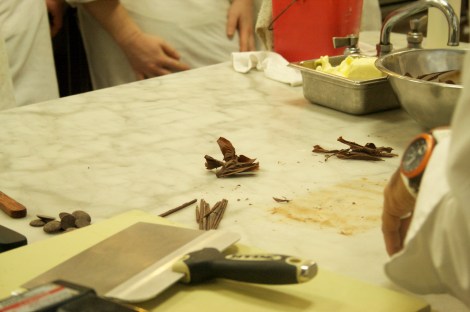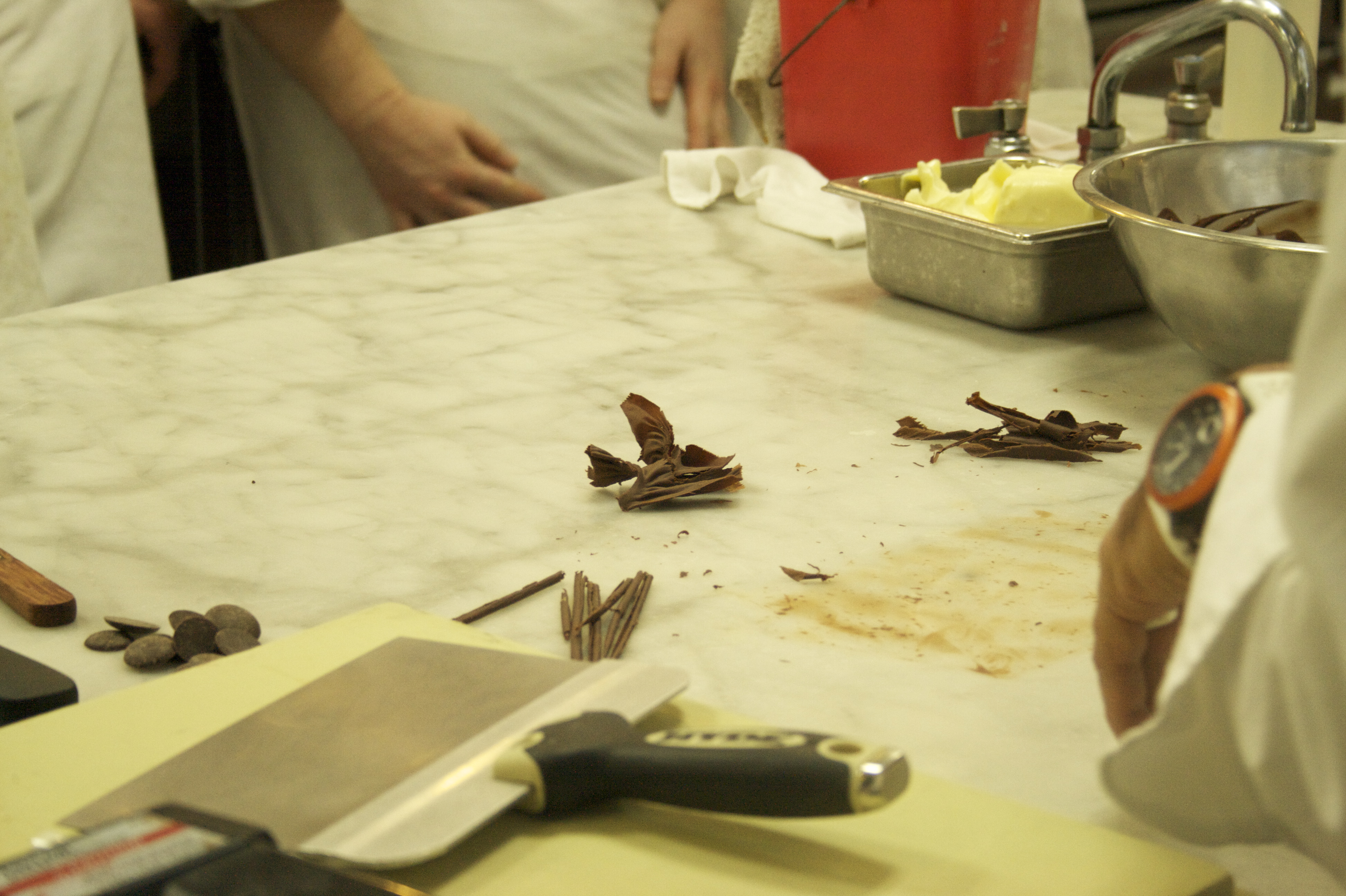 Part of pastry week is learning about chocolate, and it’s not simple. Have you ever tried melting chocolate in the microwave and it comes out a crusty, burnt mess? After listening to a pastry chef talk about tempering chocolate, or melting it to a workable state, you realize that you have to have patience to be a chocolatier. This pastry chef demonstrated the “seeding” method of tempering chocolate. Basically, melt chocolate over a double-boiler, and then add chocolate chips that have already been tempered. As far as I understand, tempered chocolate introduces beta crystals, which are the most stable crystal in chocolate and makes it easy to mold the chocolate into something or use as a frosting.