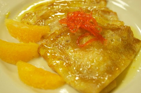 We were supposed to make two versions of this French pancake–a Brittany-style crepe (or galette) made from buckwheat and a regular crepe. But pests got to this flour before we did. So we made a double batch of regular crepes (made with all-purpose flour) and filled half with an addictive mushroom and gruyere filling. We soaked the other half of our crepes with a butter-orange sauce.