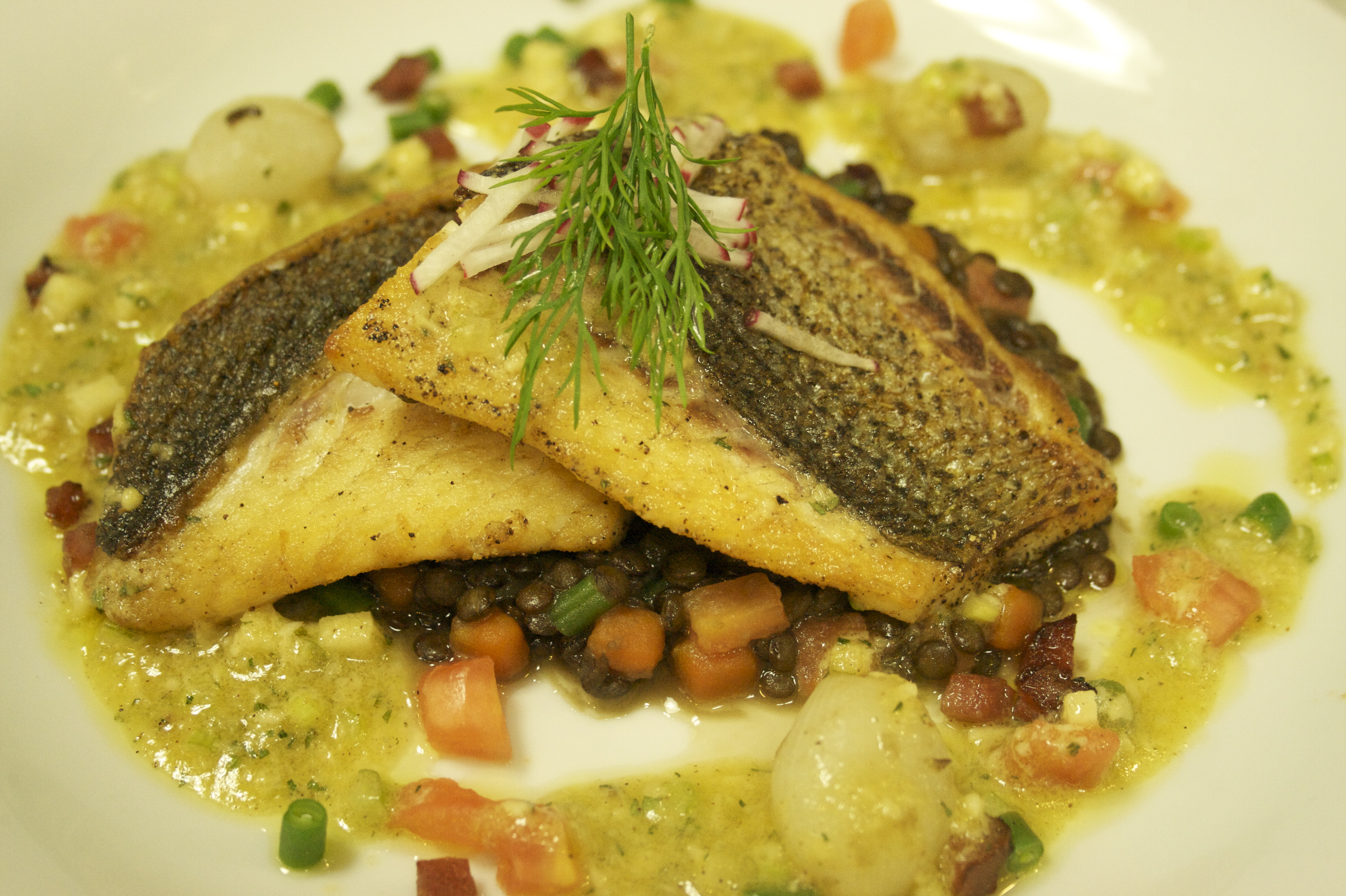 I have my suspicions that today’s recipe was a scaled back fish recipe (pun intended) because it was to be followed by a lecture on how chefs can impact a person’s health. So today’s crispy sea bass sat on top of a bed of lentils and was dressed with a light vinaigrette. No butter or cream! C’est incroyable, non?