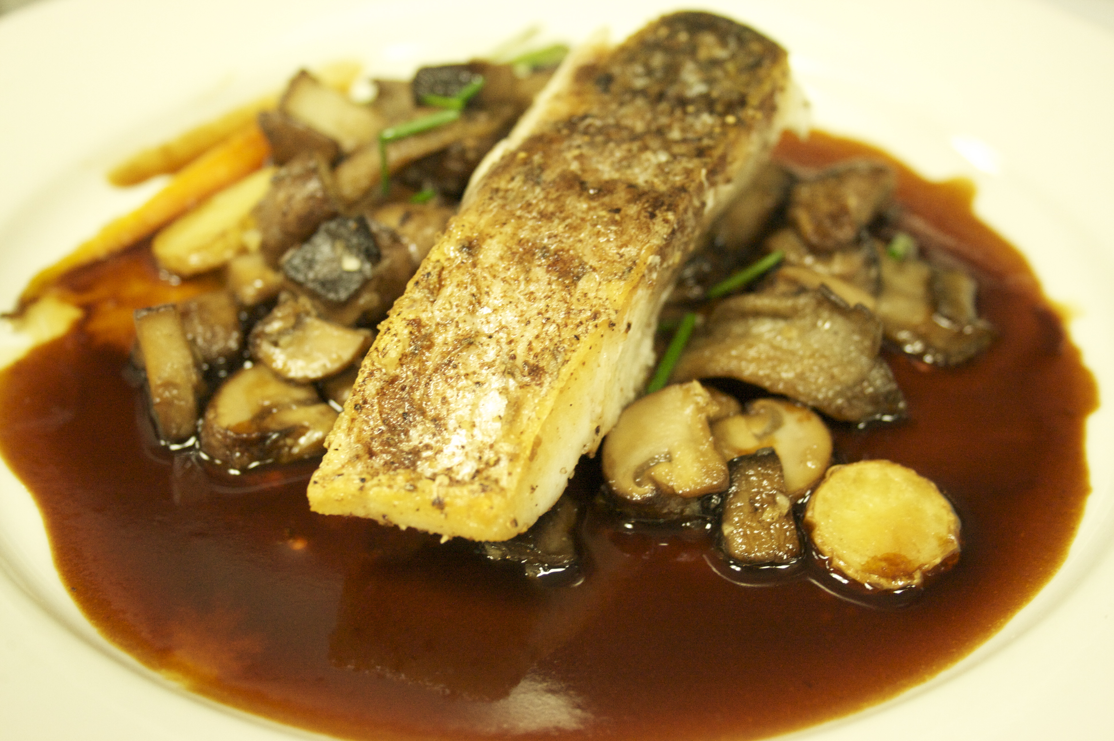 Our next course was a meaty strip of wild stripped bass that was paired with a heavy port reduction sauce and a variety of sauteed mushrooms. I’m getting a little tired of fish, though.