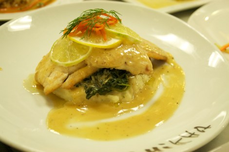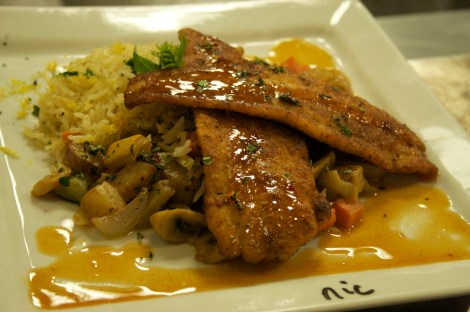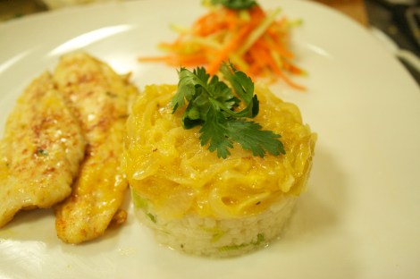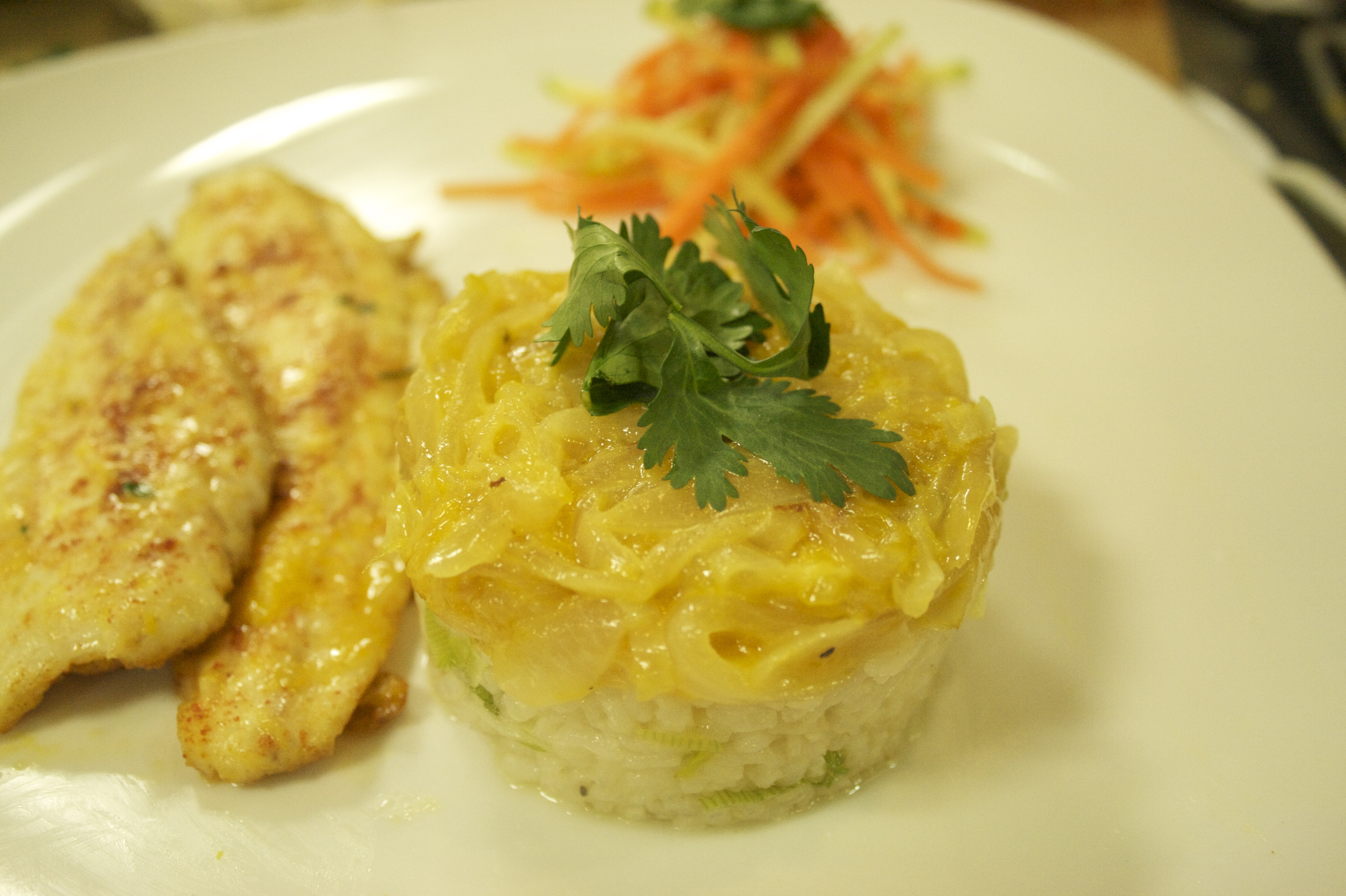 But even after a weekend of brainstorming, when I presented my dish this morning, I realized my skills were lacking. Severely lacking. I was speechless by the dishes my classmates presented. Cornmeal encrusted flounder on a bed of pureed corn with corn chips? Buttery fish on a mountain of bright, lime-infused mashed potatoes? Ingenious ideas from my talented classmates. It made my fish dish look meager–especially because I forgot to make a sauce to tie everything together. But my rice sauteed with leeks were deliciously buttery, and were supported by a layer of sweet onion and orange relish. And to add some more color, I made a tee pee of carrot, apple, and celery slaw.
