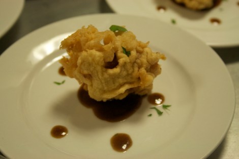 Most were delicate (read: small bites)–except my team’s and another–which chef called the “Rolls Royce” of amuse bouches. Chef Alain kept stressing that a lady wouldn’t want to eat a mammoth-sized amuse bouche. (Apparently I’m not a lady.) Note to self: Cut crostinis in small-bite sizes.