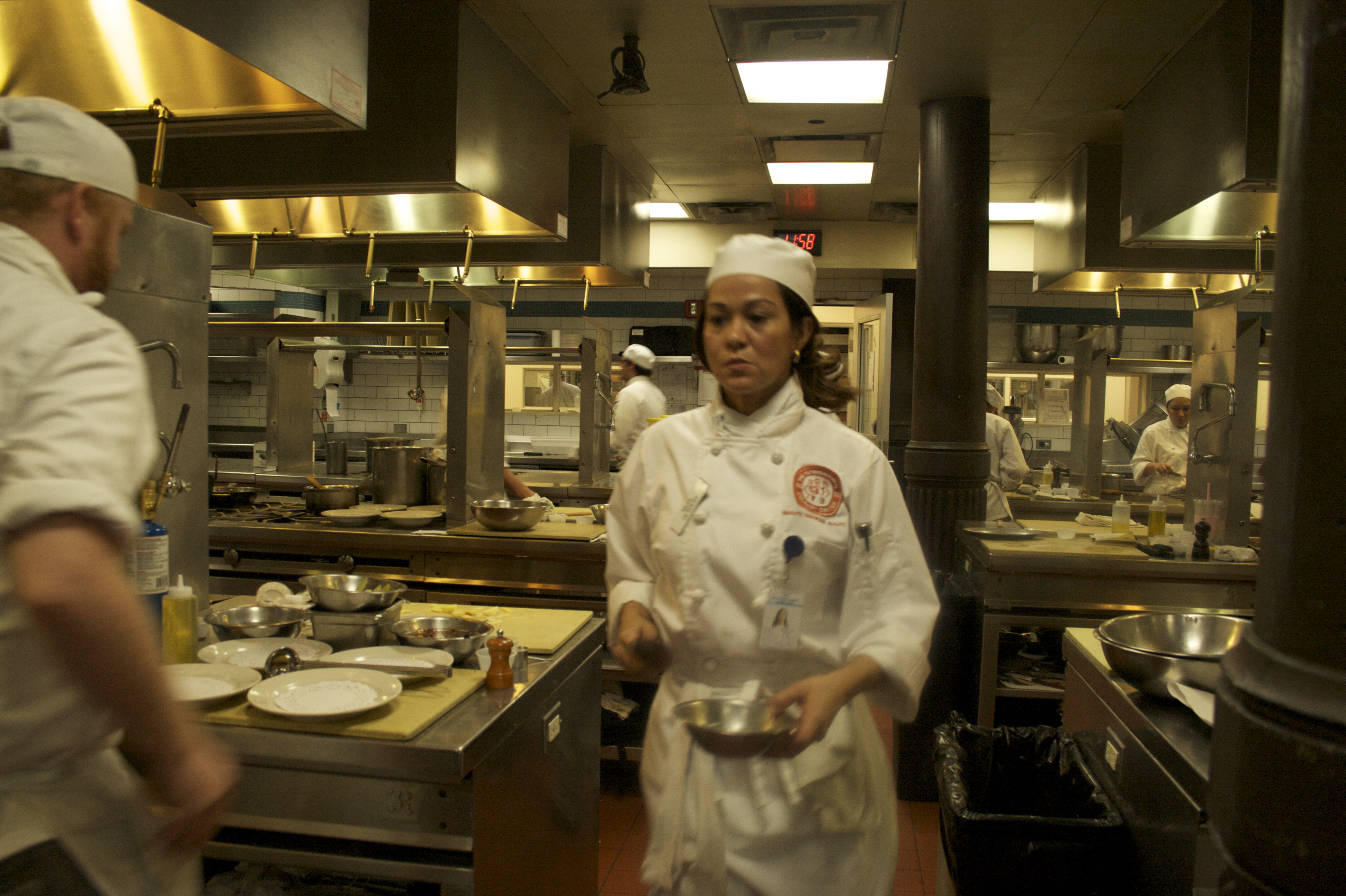 The back of the classroom has an obnoxiously large clock that’s a constant reminder whether you’re late or early. And in the last five minutes before presenting a dish, your heart starts to race as you frantically spoon soup or sauce onto a plate. Everytime something drips on your white plate, you silently (or audibly) curse to yourself because you just added seconds to the clock. And as you glance at the clock you realize you have one minute left and still have to put one more component on your plate. And when you’re done, sometimes your plates cooled off and like a maniac start shoveling in the oven for 30 seconds. It’s a stressful moment. Believe me.