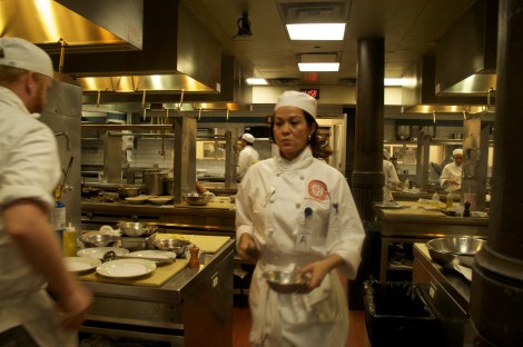 Luckily I was able to put everything together on time, and make it up to the Chef’s table with all four plates of soup. But I wasn’t so on top of my pork chop. The chop is accompanied with a potato pancake, a green peppercorn sauce, and a garnish of watercress. And to make sure each is seasoned properly, everything is hot (but not overcooked), takes more than 9 minutes–at least for me. But that’s all the time I gave myself to put my dishes together, and ended up 2 minutes late. My potato pancake also needed more time in the oven since the center wasn’t creamy enough.