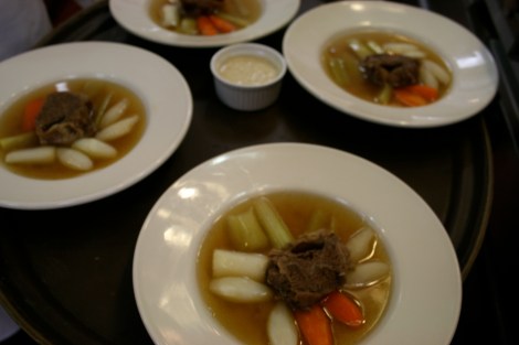 Chef Sixto and I are bonding. I don’t know if he’d describe it like that, but I think I’m hitting his soft spots. Case in point? Today I had to brûlée (burn, no really) an onion to add color to our pot au feu, or beef stew. I had two onion halves on my flattop charring away when chef came running over with a classic line, “WHAT IS THIS CACA?”
