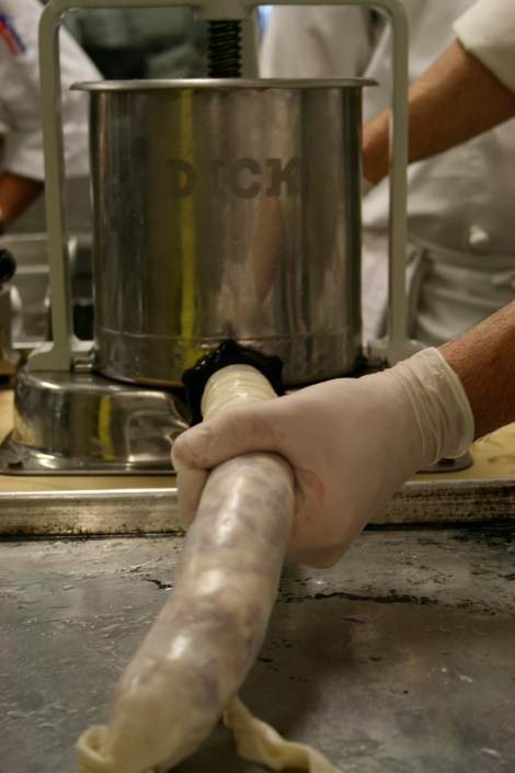 Sausage is made up of a third of fat to meat. And we tested this formula with three types of pork sausage: Italian, chorizo, and garlic. And piping meat into a casing isn’t easy. You have to man handle it to make sure it holds a consistent width. And if you crank out the meat too quickly, the casing will rip. Shika, a classmate, and I handled (literally) the chorizo, and we broke the casing every few inches. Luckily you can do some surgery on these cuts by snipping the casing and tying it off so you can start anew.