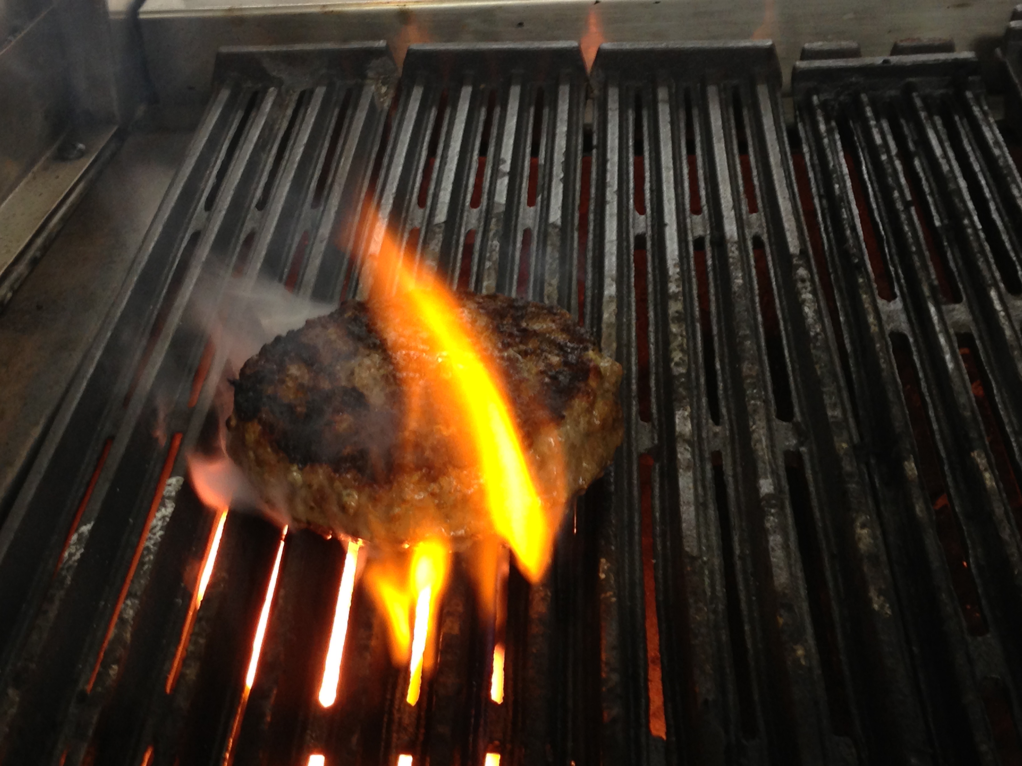 12:30 p.m.: First burger order. I thought burgers would be no big deal until Chef John gave me a long list of instructions on how to make it. And when my first order came in, I throw a burger on the grill and immediately start freaking out. Flare ups. I need firefighters to help me put out this fire. And then a second order comes in. Crap.
