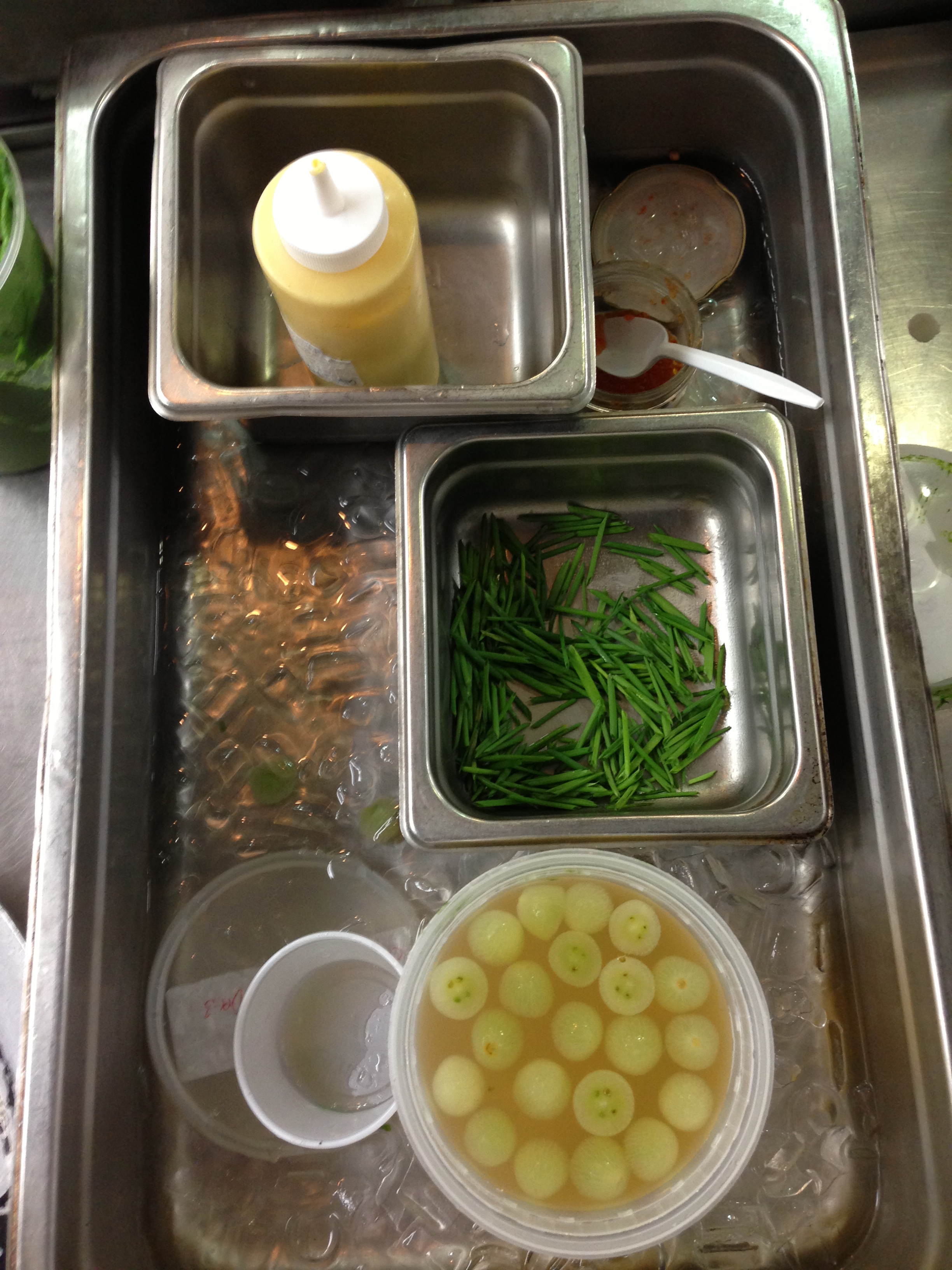 Like yesterday, service was crazy again today. Good for L’Ecole, bad for my gray hairs. My first mistake was grabbing medium-sized gloves. It’s impossible to plate a dish when you have droopy fingers. My saggy artificial skin just dragged squid ink and pickling liquid across my white plate like a Jackson Pollock painting. But I think my favorite moment during service was when I was running up a plate of scallops, which was already late, and I grabbed a piece of paper towel so I could swab off the rogue smidgen of ink on the edge of the plate. As I was walking, I tried to buff out this stain, but didn’t realize my paper towel had a bigger smudge of squid ink and I created a thick schmear of black, as if I took a mascara brush to my plate. This would’ve been so much easier to stomach if I actually had something in my stomach…