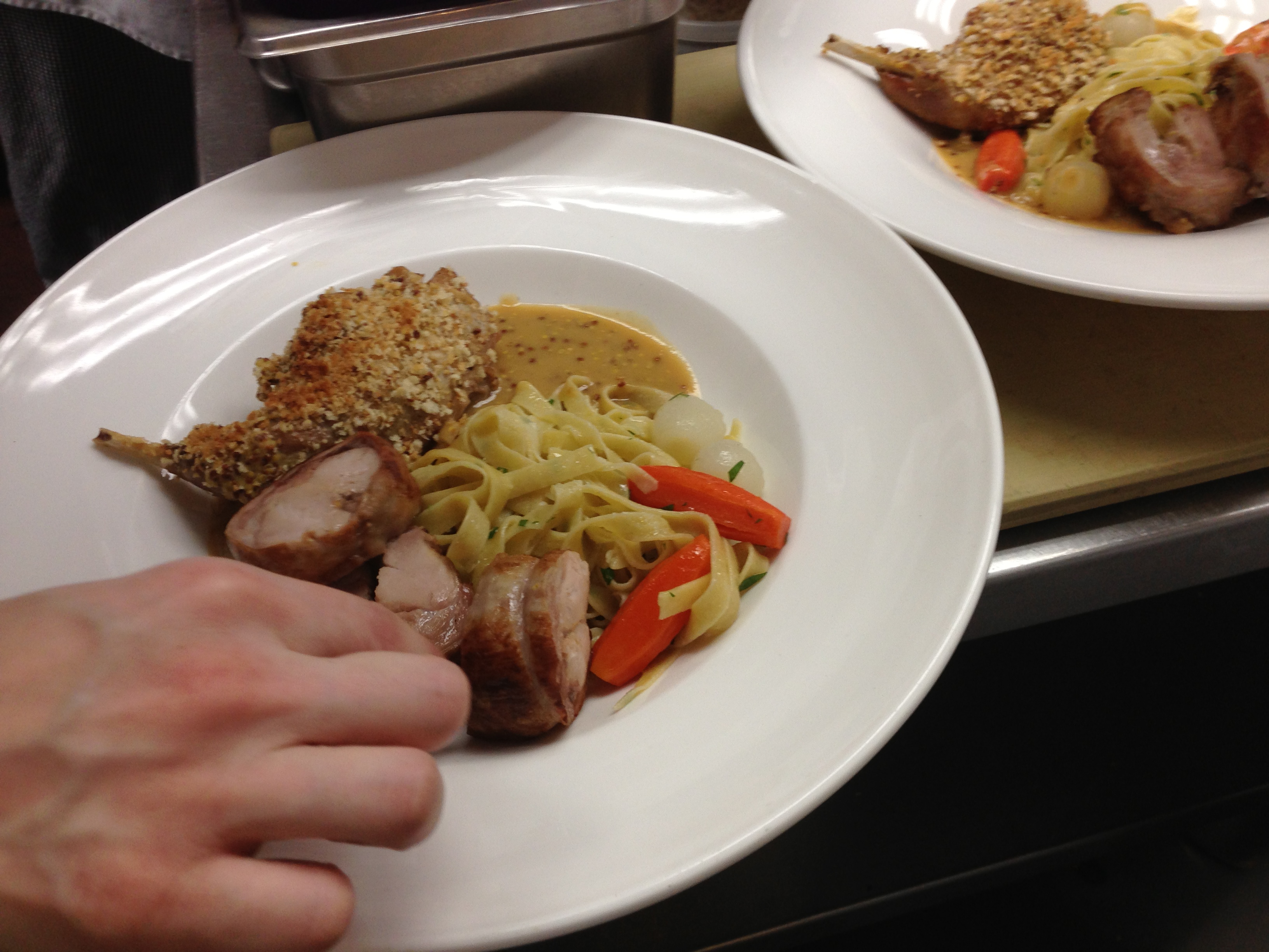 The rabbit dish has a lot of components: Braised rabbit leg, fresh pasta, mustard sauce, seared rabbit loin, carrot cocottes, and pearl onions. And we prepare each element every day. The only part I like about this dish is the pasta. It’s got a great bite to it, and fresh pasta always tastes better than the stuff you buy from the supermarket (even if it says “Made in Italy”). I have to restrain myself from eating strands of it after we saute it in butter and dust it with tarragon and parsley. It’s such a sin (in my opinion) that we then drown it in a mustard sauce. Mon dieu.