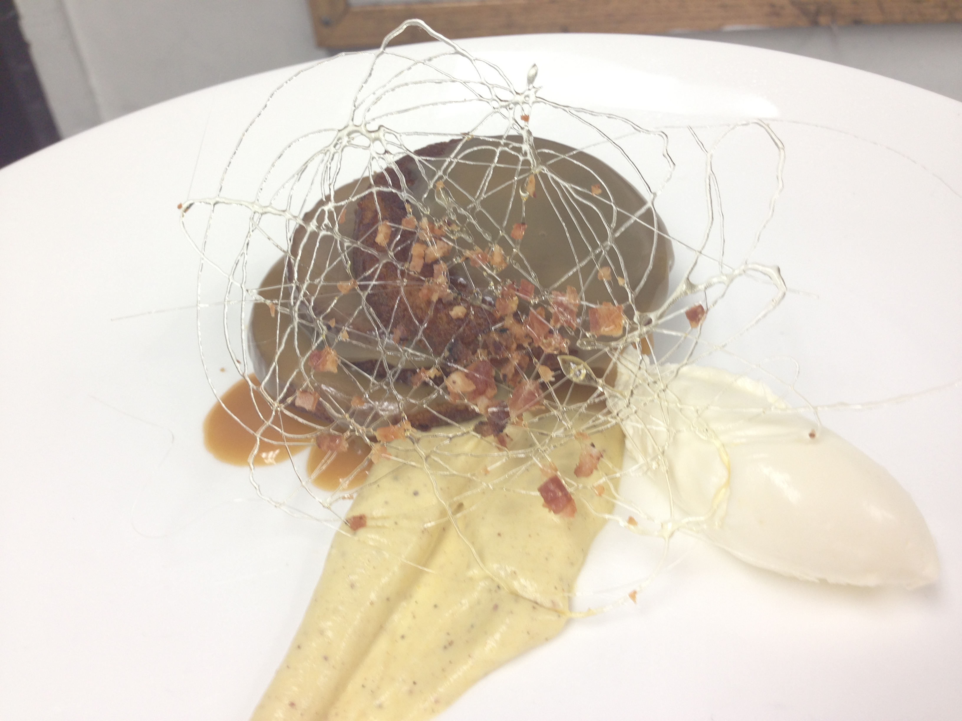 By 9:30 a.m., I already had my toffee pudding batter ready to be piped into their molds, which elicited a “How’d you do that so fast?” from my partner Ron. That’s when Chef Mimi piped in saying that it’s because he’s working too slowly. But I had another motive to banging out the sticky toffee pudding so quickly: I was making the dessert special today, and needed to have everything ready and tested by noon. Oh, and I made up the recipe and was making it for the first time today. And it’s a doughnut. Just a few wild card plays.