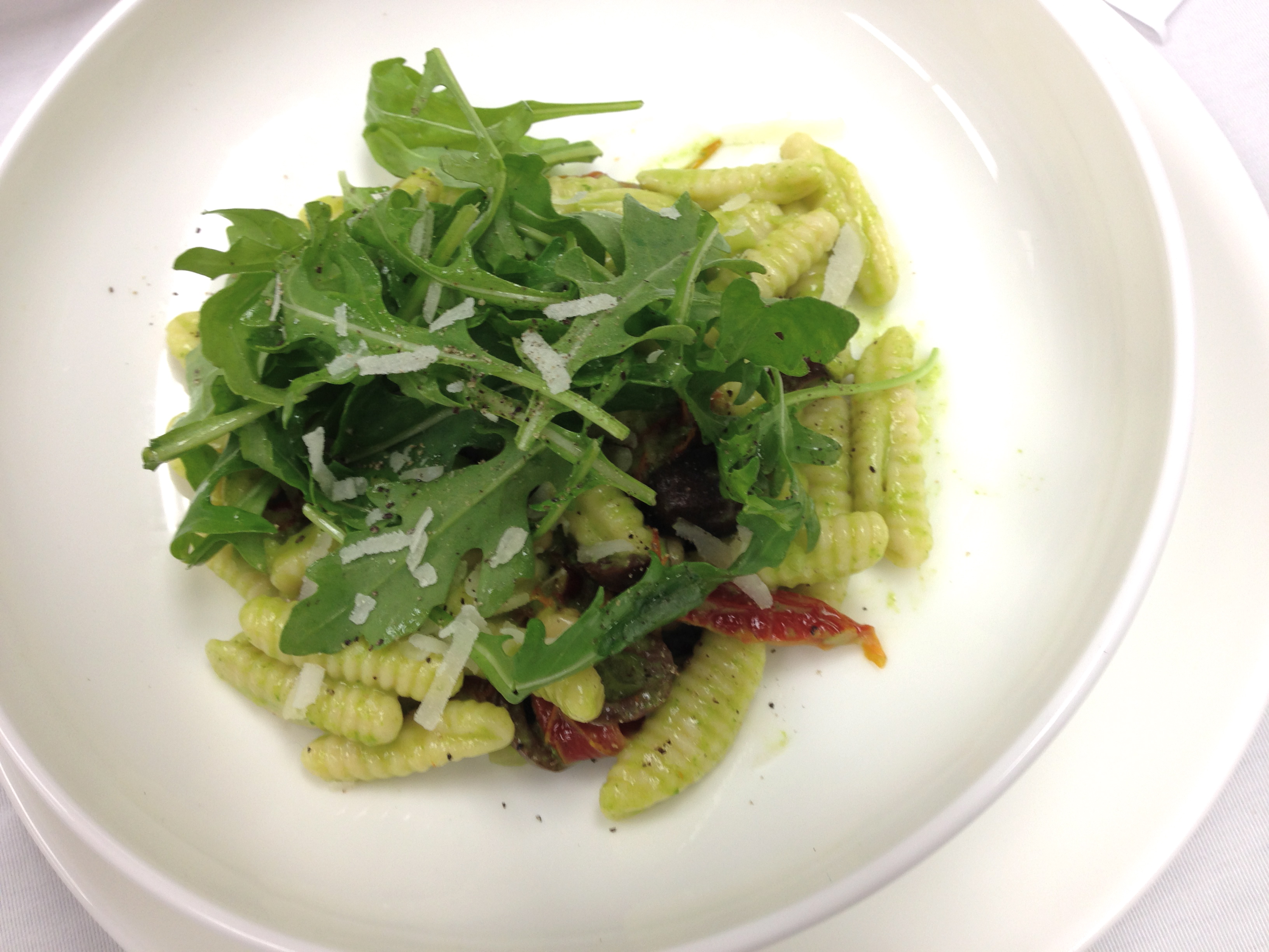Then I made it again. I pureed arugula, pine nuts, garlic, and oil together, and it was still as puckering as the first bite. But the miraculous thing about this dish is that when you mix the pesto into the pasta with the olives, pine nuts, sun-dried tomatoes, Parmesan cheese, and arugula–it’s delicious. It’s like magic. The bite of the pesto (thanks to the arugula and garlic) disappears. And the shape of the homemade cavatelli laps up the sauce. It’s a great dish. I recommend it.
