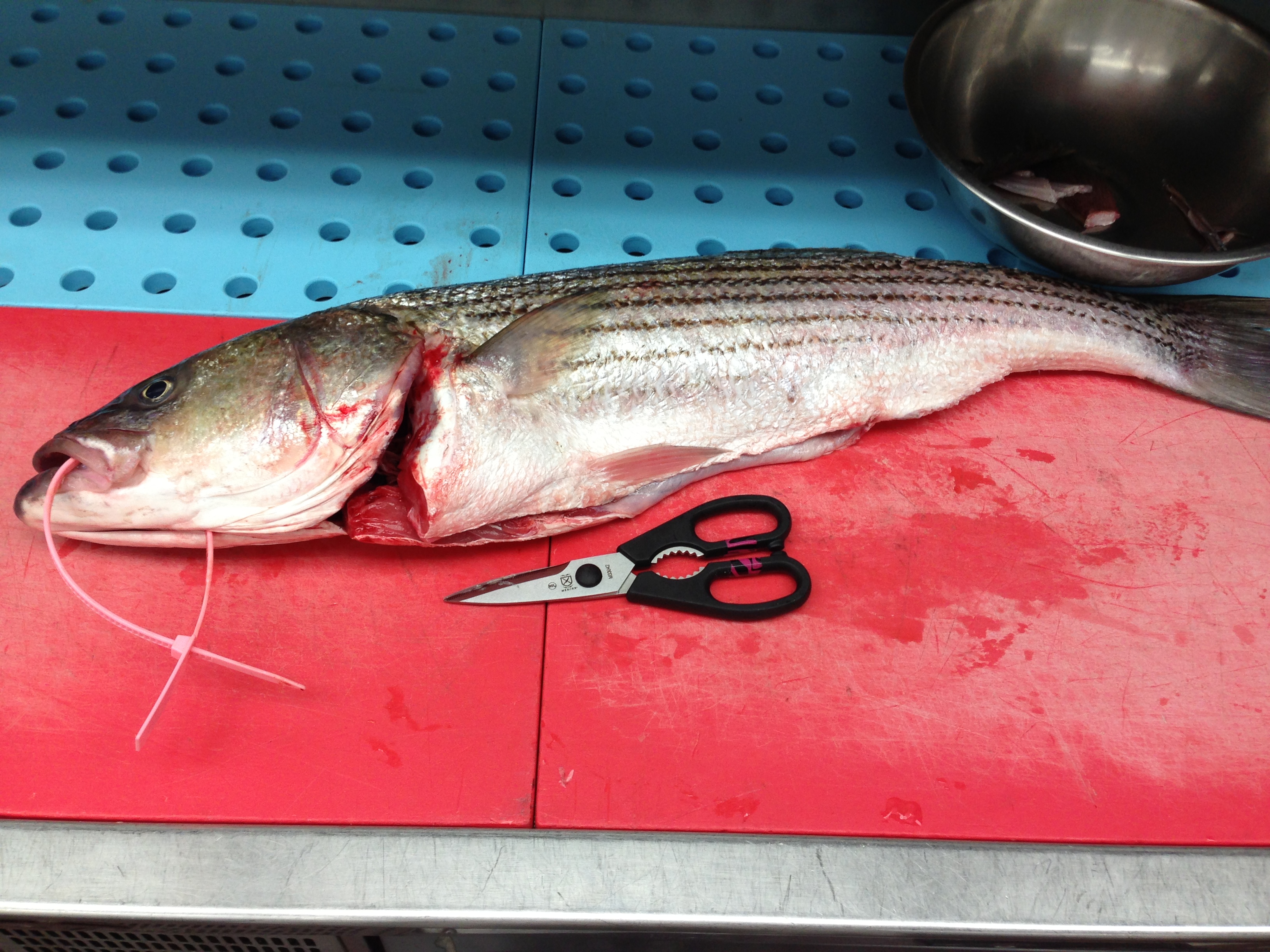 When Chef asked me if I wanted to “jump on” bass, jumping on it would’ve been easier than filleting it. Why? Because I didn’t realize bass comes in 20-pound versions that are about three feet long. The thing was about half my size.